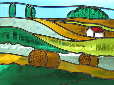 岐阜県のお客様だったのですが、北海道の美瑛町の風景をステンドグラスにしてほしいとのご依頼で制作しました。